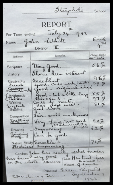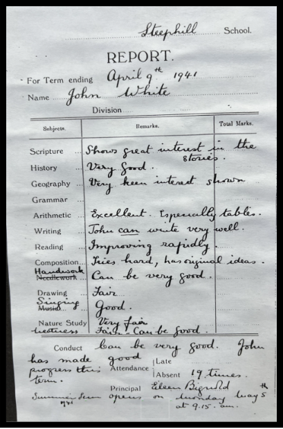 Steephill report cards from 1941/42 belonging to Mr John White. The report cards, including comments on handiwork and neatness.