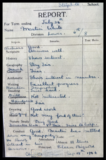 Mr Martin White’s school report, note comments for domestic duties and table manners.