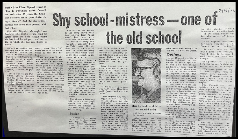 In 1973 Miss Bignold was interviewed by a local newspaper. The headline being ‘Shy School Mistress – One of the Old School.’