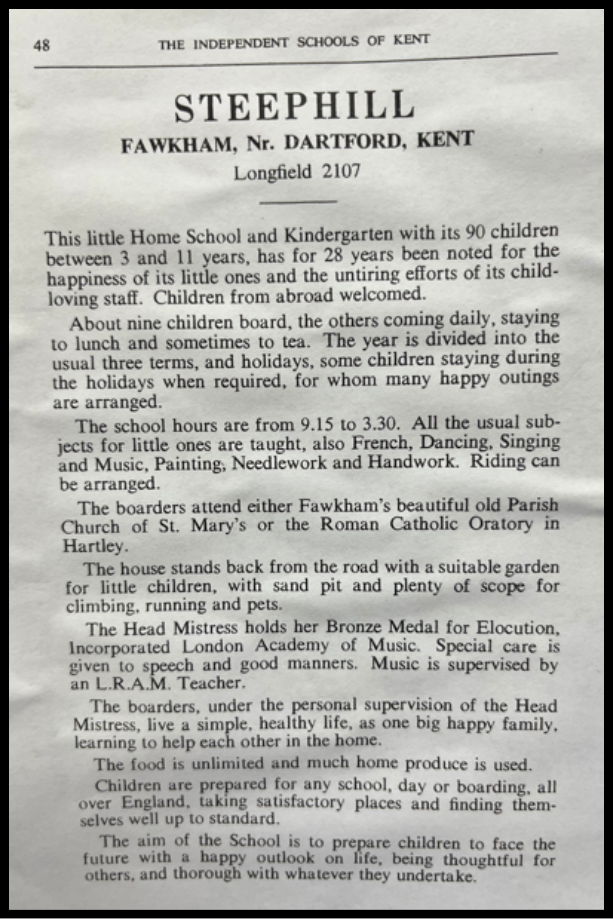 Please see the delightful advertisement in the ‘Independent School of Kent’ published in 1963.