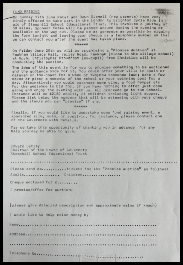 FOSS was first established in 1984 with Mrs Yvonne Higgs as Chairman. Miss Bignold recognised the kindness of a group of parents she referred to as ‘Friends of Steephill’ in a letter dated April 1987: