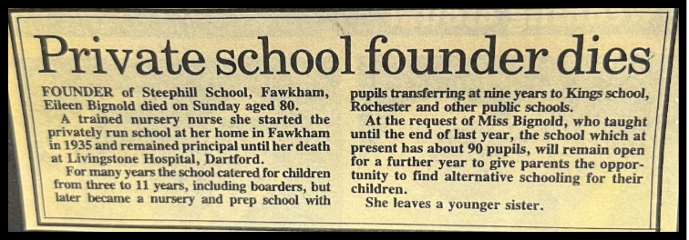 Miss Bignold passed away on 27th August 1989 at The Livingstone Hospital in Dartford.