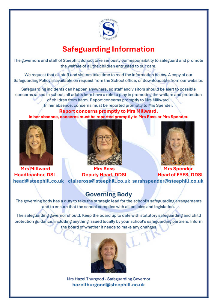 Our Designated Safeguarding Leads are Mrs Millward, Mrs Ross and Mrs Spender.